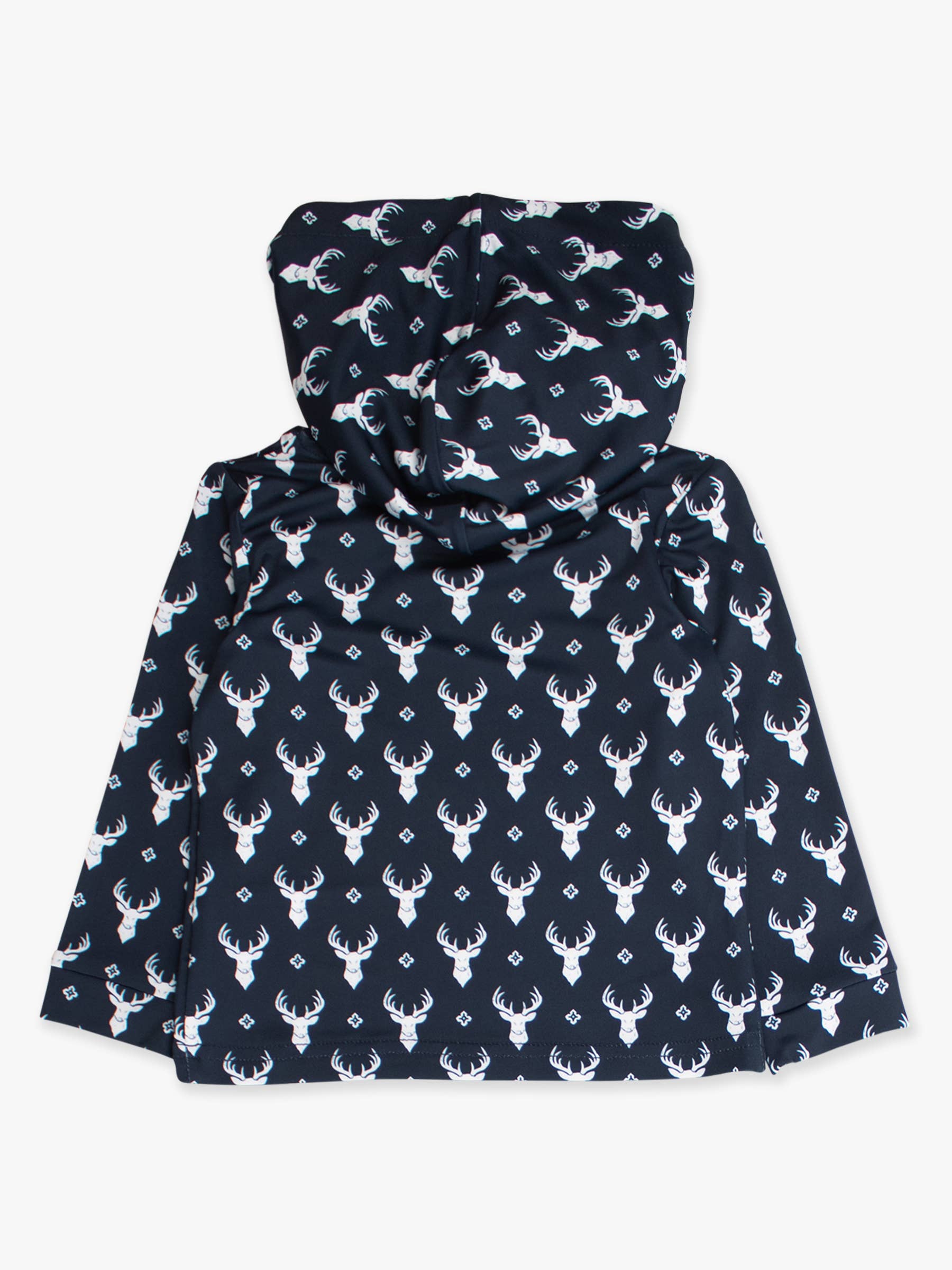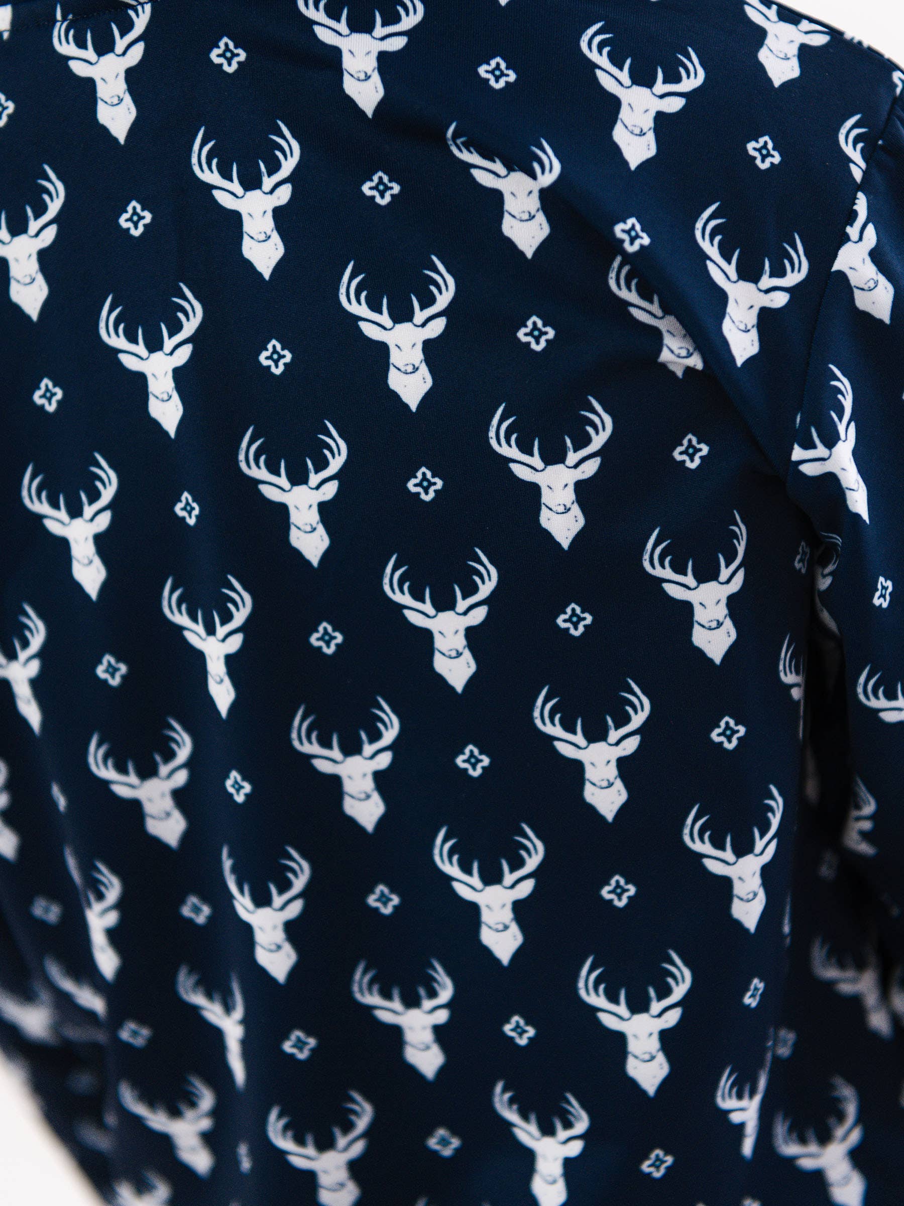 Bold stag heads repeat in a clean tile pattern against a rich navy background. Perfect for boys who love hunting and the great outdoors, this classic print brings rugged style to any look. Pairs well with Dark Navy, White.