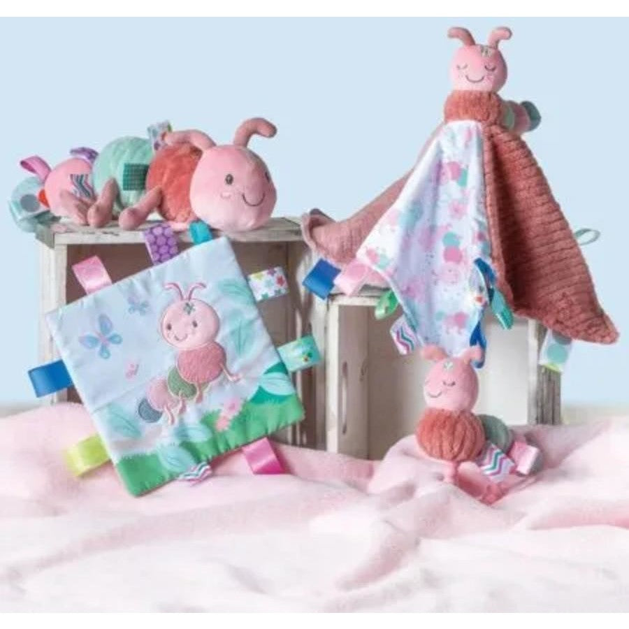 Adorned with interactive and soothing satin loop tags for baby's sensory delight