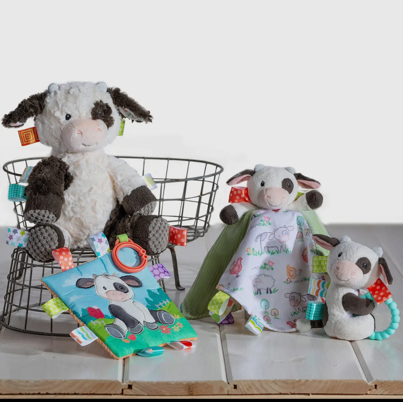 Our Taggies Buttercup, is a delightful plush toy featuring a super soft textured fabric cow in a charming combination of soft black and cream. This lovable cow comes with beautiful detailing and is adorned with the signature tactile Taggies ribbons, providing a delightful sensory experience for your little one.