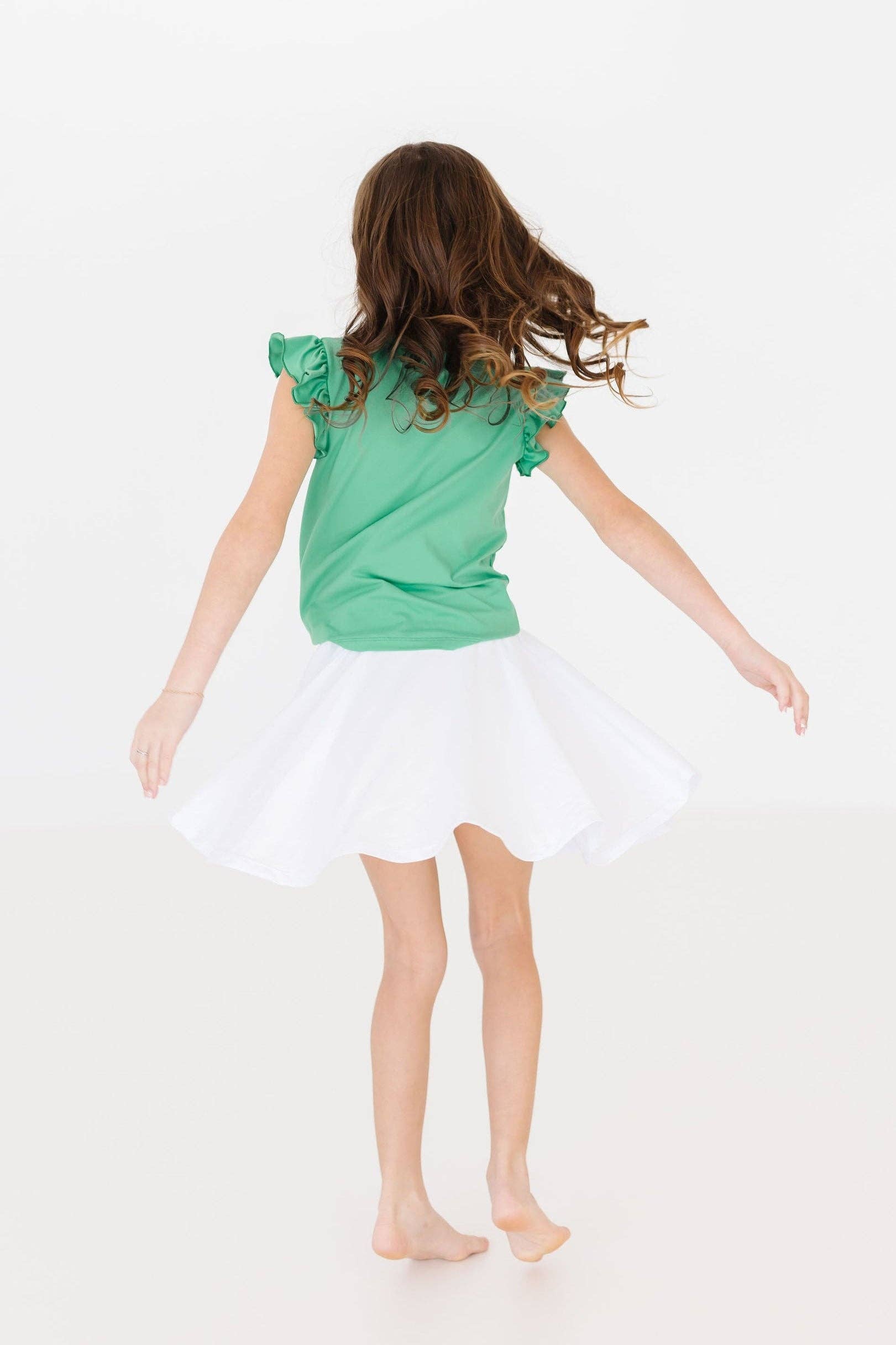 Our founders created the ruffle tee when they could not find the perfect basic tee for Mila. They wanted something simple but still girly. Our ruffle tee is perfect with skirts, shorts, leggings, or layering.