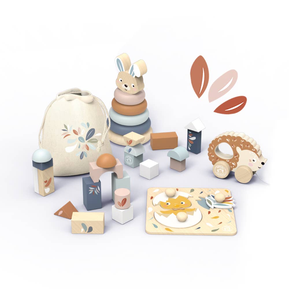 This toy box is not only visually appealing but also functional, providing a safe and spacious storage solution for your child's favorite toys. Made from high-quality wood, it ensures durability and longevity. Includes buildings blocks with fabric pouch, stacking rabbit, chick puzzle and pull-along hedgehog.