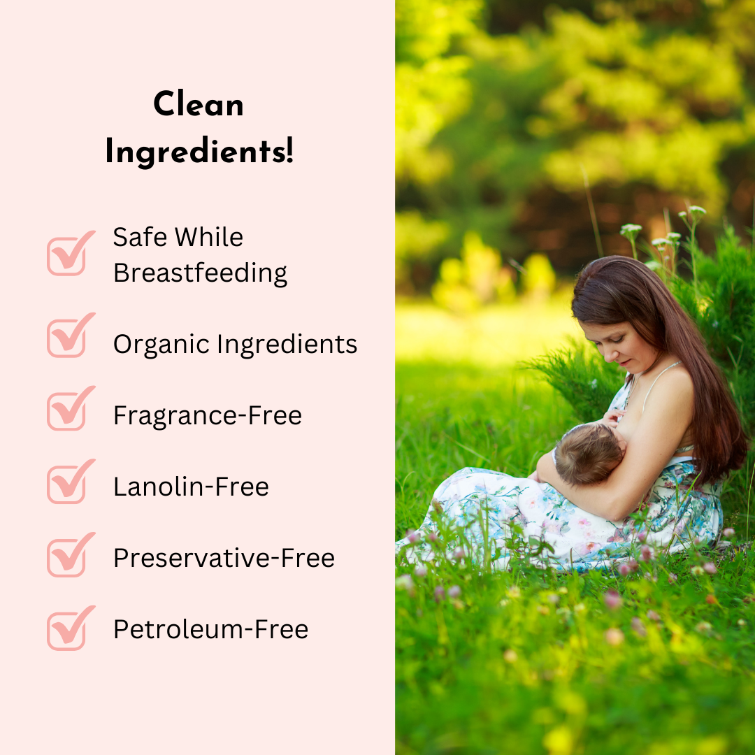 Irene Organics Soothing Nipple Butter is a gentle, lanolin-free, petroleum-free balm to help prevent and restore cracked, dry nipples while you're nursing your little one. It's a powerful formula that penetrates the skin barrier to seal in moisture and help the skin repair making for a better and easier breastfeeding experience for you and your baby. The best part is, it's made with all natural and 100% Certified Organic Ingredients to guarantee that it's safe for mama and baby while you breastfeed. Packaged in a glass amber jar to avoid the need for any preservatives and free of any toxins or chemicals that may seep into your balm from plastic containers. Also works as a great daily moisturizer or lip balm!