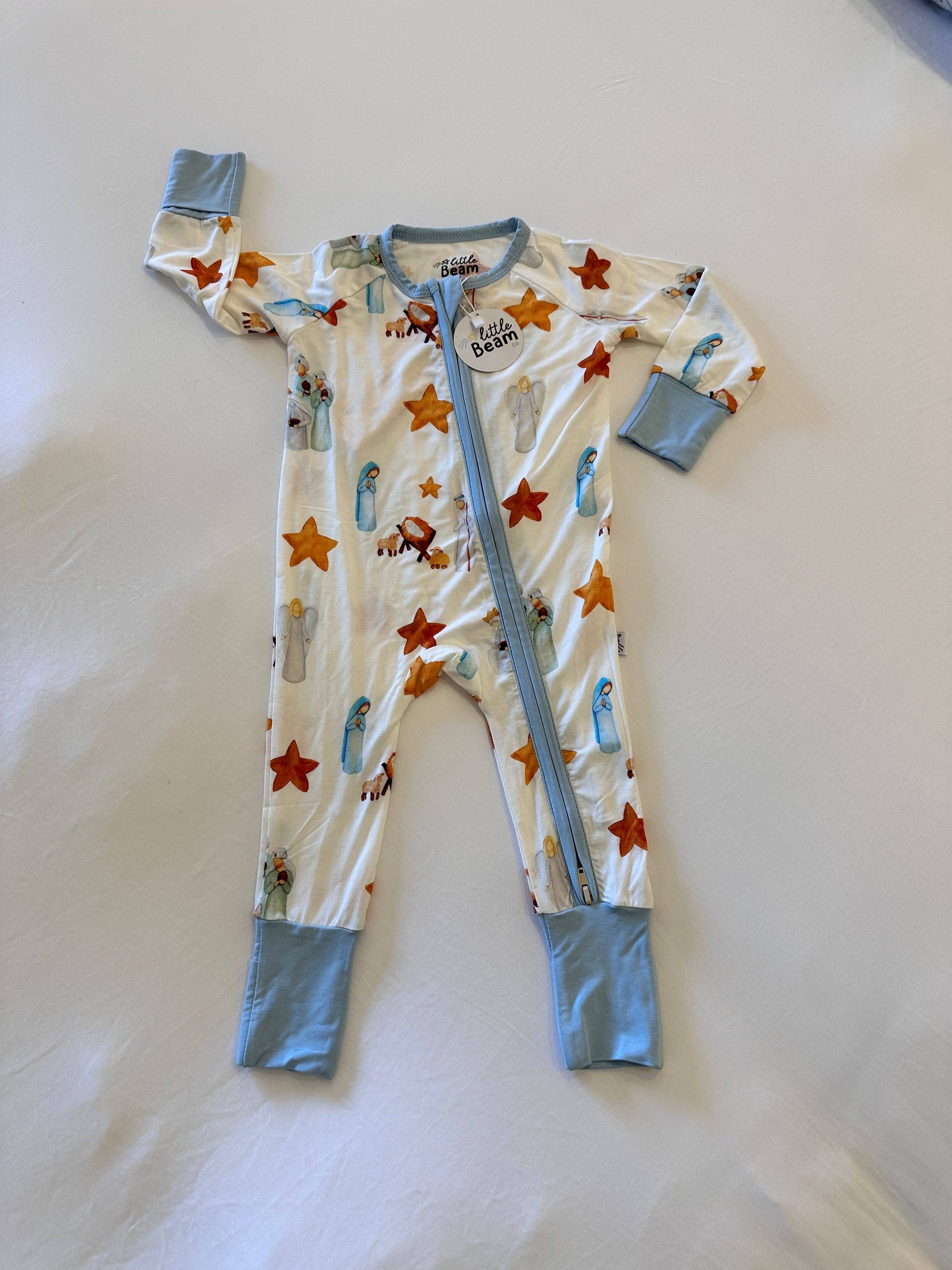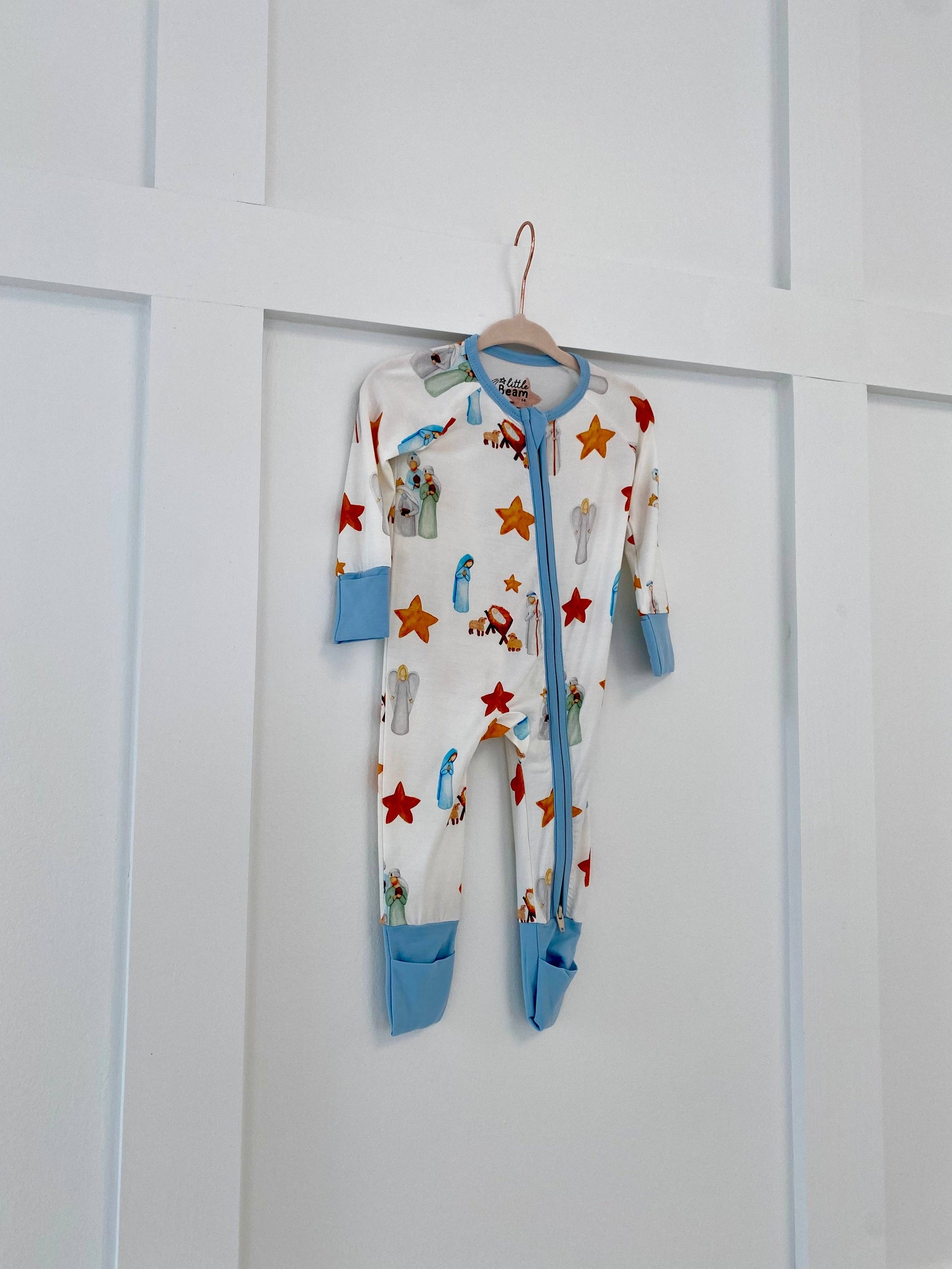 Our convertible zip pajamas are fan favorites to both little ones and parents alike! Two-way zippers provide for easy outfit changes and diaper changes. Convertible foot cuffs make these easily transition from a footless romper to footed pajamas. Foldable hand cuffs protect your little ones from scratching their precious faces. The high quality bamboo viscose fabric is ultra soft, stretchy, and naturally regulates body temperatures. These pajamas are made of 95% bamboo and 5% spandex. Our unique designs celebrate the light inside our little ones. This limited edition holiday print has beautiful watercolor designs of the nativity scene. We know these pajamas will make you beam with joy!
