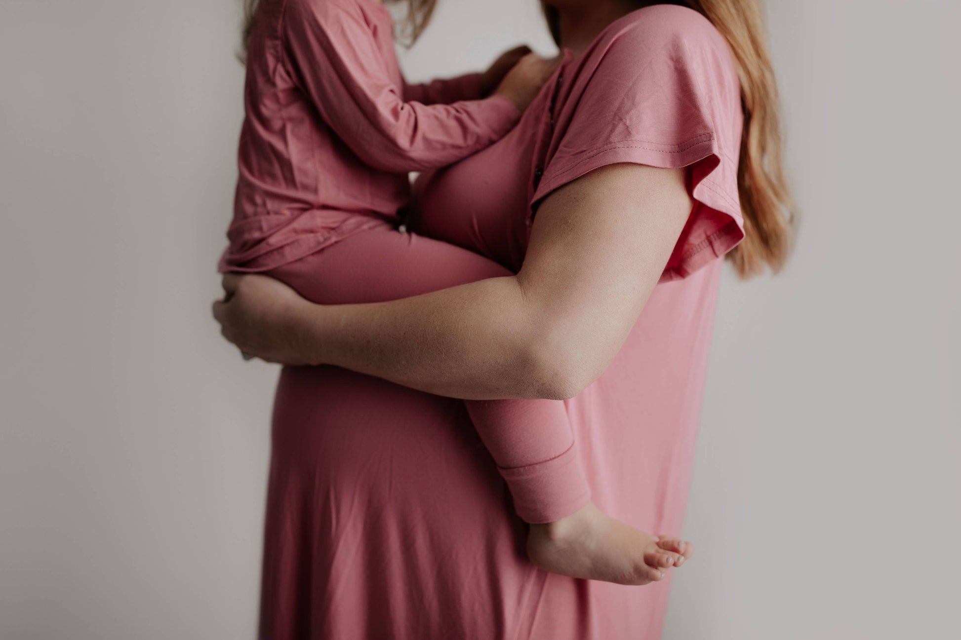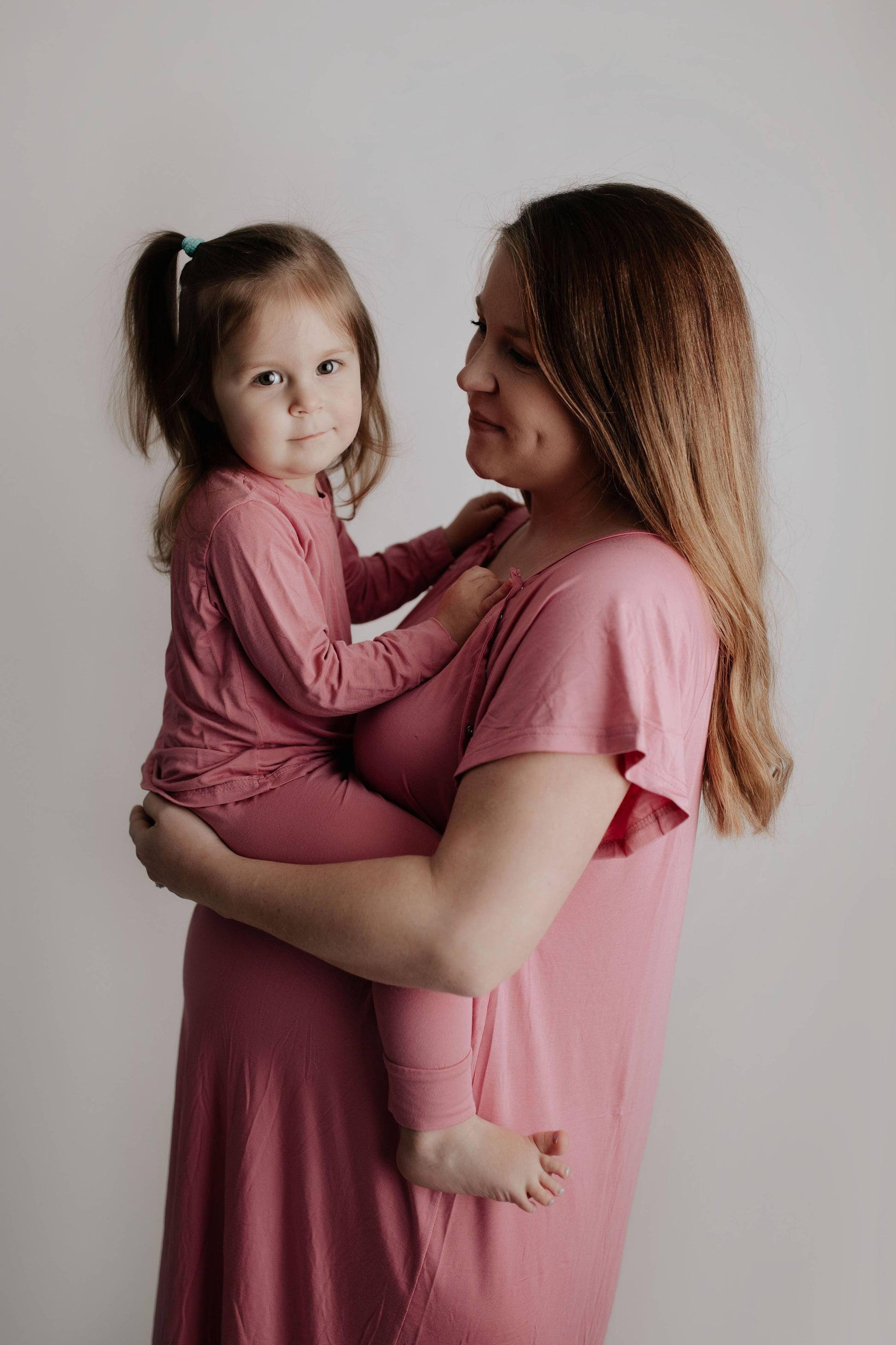 They’re made from the same signature buttery-soft material of our knotted gowns but with a stretchy, comfy top and bottom.