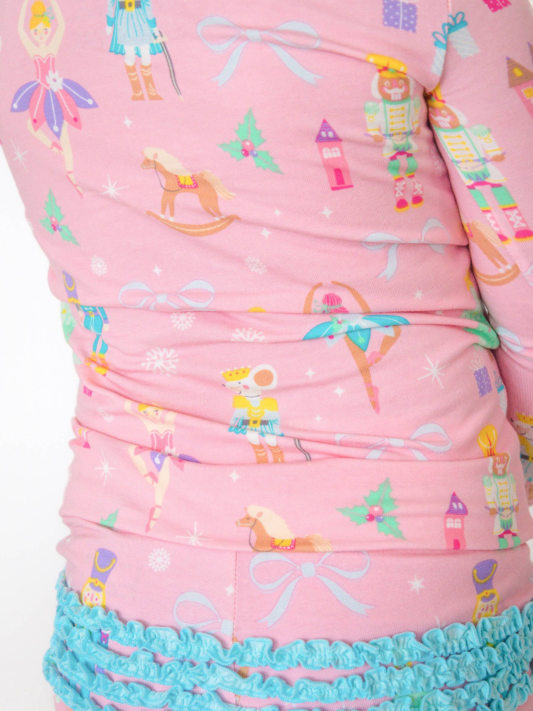 This long sleeve sleep set is soft and cozy, with precious ruffles that will bring a smile to your face. A dainty ruffle adorns the neckline of the pajama top, and classic rear ruffles add the finishing touch. Tagless for added comfort. Made from our premium SoftSnooze™ cotton modal blend, these jammies are super cozy and soft. The snuggly modal fabric is pill-resistant and great for embroidery or personalization! Nutcrackers, ballerinas, and toy soldiers make this candy-colored print perfect for attending a holiday ballet! Pairs well with Pink, Ocean Tide, Hot Pink, Spring Bud. Care Instructions: Machine wash cold; only non-chlorine bleach when needed; tumble dry low // Modal is a delicate fabric. To prevent damage and to extend the life of the garment, use laundry bag in washing machine and dryer. Fabric Content: 54% Cotton, 39% Modal, 7% Spandex Reference Code: G4633
