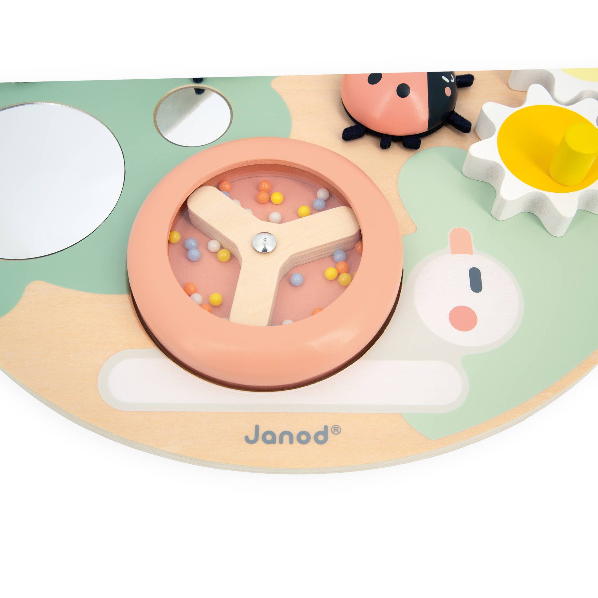 Come and see, the bee is ready to fly away, the ladybird spins around and the caterpillar goes for a walk! This beautiful wooden board includes lots of garden animals with fun features. It has 7 activities: 3 daisy-shaped gears to turn, 1 abacus, 1 ladybird that can be screwed on and off, 1 bee that makes a clicking sound when you turn it, 1 snail whose shell turns to rattle the multi-colored beads inside, and finally, 3 mirrors, 1 of which is hidden under the felt leaf. This board is very practical and adapts to the child's most comfortable play position. Thanks to its movable base, the activity board can be set at a 45° angle so that the child can play easily when seated or at a table.