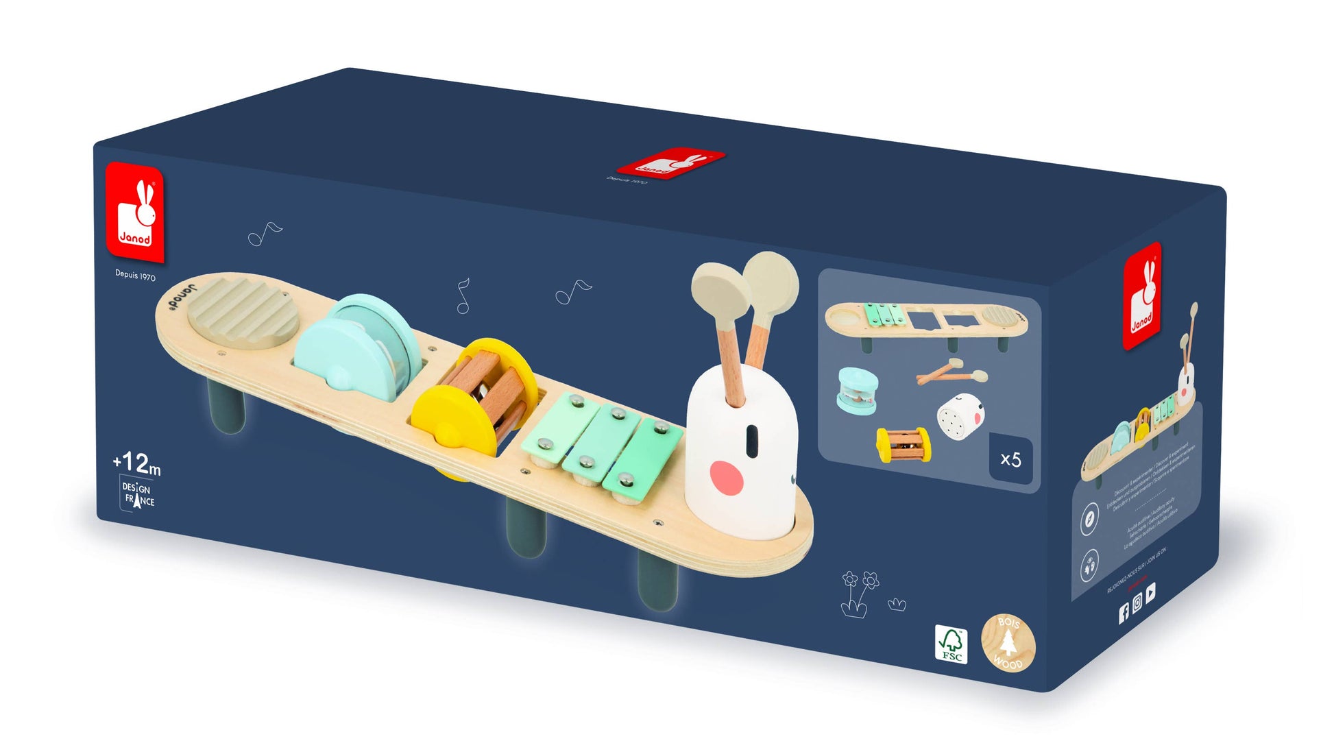 Do Re Mi….this is a particularly fun caterpillar! Let your child experiment and discover each part of this musical caterpillar’s body. This musical stand has 5 instruments. The head is a maracas that doubles as storage for the beaters. On its back you will find a xylophone and a scratcher in soft colors, as well as 2 removable rattles. The first has 3 bells and the second is a rain stick. Your child can spin them on the base or shake them up and down. This musical stand is ideal for helping your child discover and experiment with different sounds in order to develop their hearing acuity. Wooden musical toy. For children aged 18 months and over.